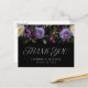 Moody floral wedding thank you postcard featuring a top border of ivory, purple, and burgundy flowers with lush green foliage and dark berries. The elegant purple floral design is complimented by "thank you" displayed in modern typography. Personalise the wedding thank you postcard with your names, wedding date, address, and typed or handwritten message. The gothic floral wedding thank you postcard is perfect for your fall or Halloween wedding. Designed to coordinate with our Moody Gothic Floral wedding collection.