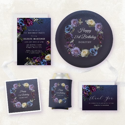 A beautiful and elegant thank you card designed especially for a 21st birthday party. The elegant floral sprigs contain rustic purple roses and peonies with pops of blue, white and pink. It is part of the Moody Purple Flowers Collection. It contains all the items you need to create a pretty and unique stationery suite, party supplies and decorations/