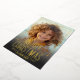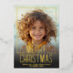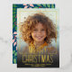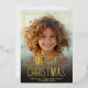 A modern look for a holiday photo card. A gold foil words - Merry Christmas - is on top of the photo and holiday greeting. Colourful blue and green botanical leaves are included on the back.