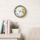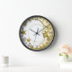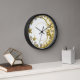 The size of the clock is dramatic and the abstract alcohol ink design is soothing and intricate at the same time. I chose the black frame that adds pop to the blue and gold design. The gold printing would be better in a slightly darker or larger font. I love it and I’m looking for just the right place in ny new apartment. I would recommend this clock for a personal gift or a present. I feel that the quality is excellent for the money! I’m a bit of a clock nut so I’m pretty particular about my purchases. The clock is larger in diameter than many if the clocks I have, so it stands out very well. I think a slightly darker printing color and a moderately larger size would best suit a professional decor or add more impact in a work place item.