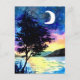traditional watercolor artwork depicting a colourful sunset above distant hills and a lake while the moon and stars can already be seen in the dark night sky above the tree tops on a postcard