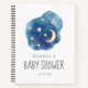This moon and stars baby shower gift list notebook is perfect for a simple baby shower. The modern whimsical design features a navy blue watercolor cloud shape with a yellow quarter moon and stars. Personalise with the name of the mum-to-be.