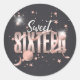 You can give your daughter the moon and stars (figuratively at least!) with this fun celebration sticker in sparkling shades of rose gold on a charcoal background. Stars and planets are sprinkled liberally over a rose gold ribbon that winds through creative typography of 'Sweet Sixteen'. A unique and cheerful addition to your mail or party favours. Search ID788 to see other products and colour options with this glam background design.