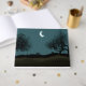 This design features a charming illustration of a crescent moon being held on a string, as though it were a balloon. A girl is sat on a park bench holding the string.