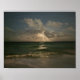 Moon behind clouds over the ocean is an original digital painting of a perfect dark and light moment. Deep blue sky, dark green sea, white waves and bright moonlight peeking through clouds.