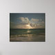 Moon behind clouds over the ocean is an original digital painting of a perfect dark and light moment. Deep blue sky, dark green sea, white waves and bright moonlight peeking through clouds.