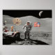 An APOLLO astronaut stands on the moon's surface near a lunar rover with an American flag planted beside them. But is it real as the moon is clearly visible in the distant sky above the lunar landscape.