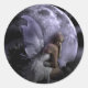 This beautiful fairy sits crouched down and ready to fly, while glancing back and at the viewer. Behind this pretty fair in a white dress with lavender wings is a very large full moon. A dark and emotive fantasy artwork.