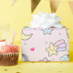 A cute pattern with happy stars, moon, clouds and rainbows on a pink background.