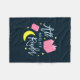 Cozy up with this bookish blanket featuring the words "All Night Reader" surrounded by the yellow moon and stars and pink books against a dark blue background.