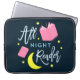 Perfect for book lovers, this laptop sleeve features the words "All Night Reader" surrounded by yellow moon and stars and pink books against a dark blue background.