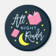 Show off your bookish side with this bookish magnet featuring the words "All Night Reader" surrounded by yellow moon and stars and pink books against a dark blue background.