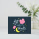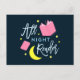 Perfect for book lovers, this bookish postcard features the words "All Night Reader" surrounded by yellow moon and stars and pink books against a dark blue background.