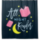 This bookish shower curtains features the words "All Night Reader" surrounded by the yellow moon and stars and pink books against a dark blue background.