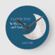 Navy blue and white "I love you to the moon and back" wall clock for your baby boy's nursery or bedroom. Personalised with a name. Contact us for help with customisation or to request matching products.
