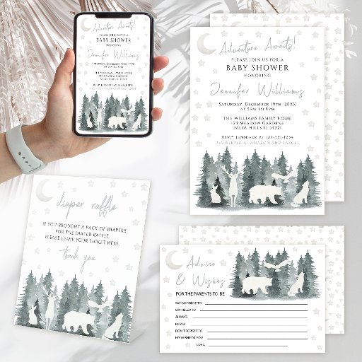 Night time moon and stars with forest pine trees and woodland animals baby boy shower or gender neutral baby shower. Advice and wishes cards for parents to be.