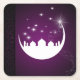 Illustration with silhouettes of the moon, stars and a mosque. Eid Mubarak lettering in arabic script and an ornamental border.