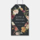 Attach these elegant floral tags to your wedding favours to say thank you to guests in chic style. Tags feature a geometric border of lush autumn flowers in watercolor shades of marsala, burgundy and blush pink, with dark green leaves and foliage on a rich off-black background. "Love and thanks" appears in the centre with your names and wedding date. All text is editable for ultimate customisation. Designed to match our Moonlight Garden wedding collection.