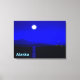 Moonrise in the Inside Passage off the coat of Alaska. Mountains in the distance and a fishing boat heads north. Text reading "Alaska" appears in glowing blue and white.