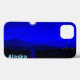 Moonrise in the Inside Passage off the coast of Alaska. Mountains in the distance and a fishing boat heads north. Text reading "Alaska" appears in glowing blue and white.
