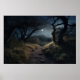 Digital artwork of a winding path through a woodland meadow lit by moonlight.