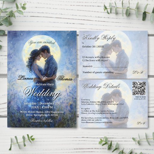 Celebrate your love under the stars with this enchanting moonlight wedding invitation. Featuring a romantic watercolor illustration of a couple embraced beneath a glowing full moon, this celestial design sets the tone for a magical and unforgettable celebration. Perfect for evening weddings, boho chic ceremonies, or couples who want a unique invitation that tells their love story. Personalise with your names, date, and venue details to create a truly one-of-a-kind keepsake for your special day.