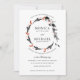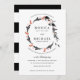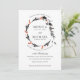 Elegant leaf and flower inspired wedding invitation design featuring a delicate wreath of foliage in black, grey and coral set on a white background.