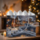 A Christmas holiday gift bag featuring a watercolor illustration of a moonlit Christmas village with brightly lit snow covered cottages connected by charming snow covered stone walking bridges over a flowing meandering river.