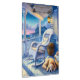 This serene coastal porch scene captures the warmth of a peaceful evening by the sea, featuring a wicker rocking chair bathed in moonlight, a loyal golden retriever sleeping soundly at its base, and a glowing full moon rising over gentle ocean waves. The pastel palette enhances the romantic coastal view, with soft blues, purples, and warm sunset tones casting gentle reflections across the wooden porch. A flower-filled window box and a basket of painted eggs add charming details that evoke a sense of home and seaside tranquillity. The composition blends rustic charm with beach house decor style, creating an atmosphere that invites relaxation and quiet contemplation. This moonlit ocean scene is ideal for lovers of nature, pets, and nostalgic beach moments. AI generated artwork.