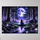 A lone girl stands beneath a bright moon, surrounded by a glowing forest and a silver stream. The magical aura is amplified by shimmering crystals and twinkling starlight on her flowing gown.