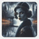 An elegant woman with an updo hairstyle and a fur-lined coat, gazing out at a cityscape illuminated by the night