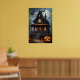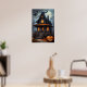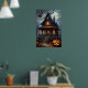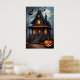 Unveil the spirit of Halloween with a captivating poster. A spook-tacular wooden house takes centre stage, shrouded in an eerie ambiance. The bright moon casts an enchanting glow, while bats dance around its rooftop. Carved pumpkins line the front, adding a touch of whimsical fright. This digital artwork captures the essence of Halloween in a classic yet electrifying style.