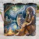 A contemplative Native American woman, adorned in a vibrant feathered headdress and traditional fringed attire, sits by a crackling campfire beside a tranquil lake. A loyal grey wolf stands protectively beside her, while other wolves lurk in the moonlit forest, creating a serene and mystical wilderness scene under a glowing full moon.