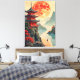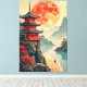 A stunning red pagoda sits atop rocky cliffs under the glow of a massive moon, surrounded by serene waters.
