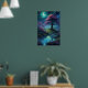 Under the watchful gaze of a majestic tree atop a small hill, a charming river weaves its way through the landscape. Beyond, a mystical forest beckons from the distance. The night sky is aglow with enchantment, its canvas adorned by a bright half moon that adds a touch of magic to this serene and captivating scene.