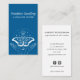 Elegant business cards for psychotherapy studio, energy healing, life guidance, yoga or massage studios, massage therapy, meditation teacher, natural health counsellor, spas or wellness professionals feature a white illustration of a two opened hands creating energy with a spiritual moth a third eye moon and stars in solid sky blue colour background.