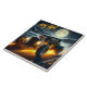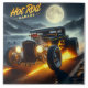A vintage hot rod races along a coastal road under a full moon, leaving a trail of flames in its wake. The dark waters and rocky scenery create a thrilling ambiance of speed and nostalgia.