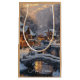 Christmas holiday gift bag featuring a watercolor illustration of a moonlit Christmas village with brightly lit snow covered cottages connected by charming snow covered stone walking bridges over a flowing meandering river. A solid colour background in colour to match illustration.