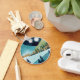 A beautiful landscape with unique textures showing a mountain lake landscape with a rising moon and starry sky in shades of blue, gold, green, and turquoise.