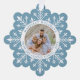 Beautiful snowflake shaped Christmas card and ornament in one printed with your photo in a round frame surrounded by a white snowflake against a moonstone blue background. Add another photo on the back. Light blue and white snowflake shaped happy holidays card and ornament in one, printed with your photos and family name and the year.