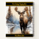 A striking moose gazes peacefully by a serene river, framed by snowy forests under a soft winter sky.