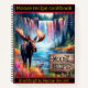 A stunning moose stands gracefully beside a serene lake with a majestic waterfall cascading in the background, surrounded by vibrant autumn foliage and towering trees.