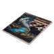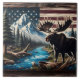 A moose stands by a serene lake with a mountain backdrop and an American flag design, surrounded by tall evergreen trees and flowing water.