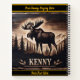 A beautifully crafted dark wood artwork showcases a majestic moose standing among tall trees and mountains, exuding a sense of wilderness and serenity.