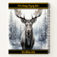 A magnificent moose gazes directly, surrounded by snow-covered trees under a winter sky. The serene atmosphere captures nature's beauty.