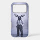 A composed anthropomorphic moose dressed in a classic shirt, tie and suspenders, standing within a misty forest setting. The cool monochrome palette and minimalist styling create a calm yet powerful statement piece for modern interiors.