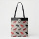 The background on this cute tote bag is a pattern of red, maroon, black and tan silhouette moose images. At the top centre is a matching circle banner with your monogram, placed on a black top border. The back of the bag has the same pattern and images.