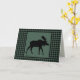 Linda Baysinger Peck’s painting of black silhouette of a bull moose, with green and black plaid background.
