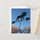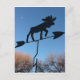 Moose weathervane silhouette during a winter's blue sky sunset with partial moon in the background and leafless tree limbs...