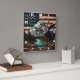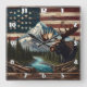 A large moose stands near a river, framed by pine trees and mountains, with a backdrop of the American flag made of wood.